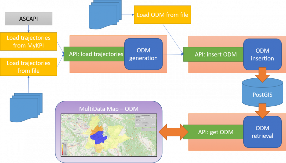 In the Snap4City platform, OD matrices are stored in a PostGIS database, that is a spatial database that extends the PostgreSQL object-relational database by adding support for geographic objects and allows location queries to be run in SQL. In this way, polygonal descriptions of the origin and destination areas can be associated with flow information and easily retrieved.