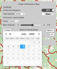 - [selector/switch] Time period: if the switch is set to ON, the map is animated by showing the different OD data for several days, according to the time span specified in the selector (accepted values are week and month)