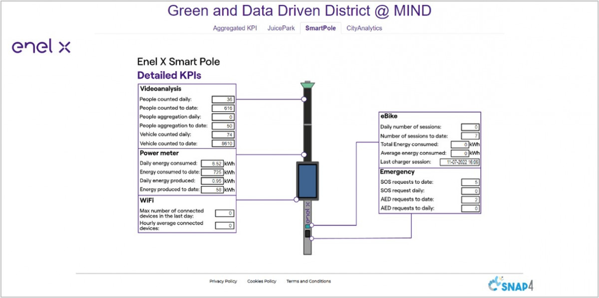 Thanks to the support of SNAP4 company and by exploiting the Snap4City capabilities, public web dashboards showing the harmonized data collected by the sensors present on the devices have been implemented, also by showcasing analytics data related to the EXPO area in Milan. The solution demonstrates the possibility to make effective use of sensors’ data coming from smart recharging stations by providing decision support tools based on data related to: energy consumption with respect to the energy produced by the integrated PV panels, people and vehicle counting and tracking, parking monitoring, e-bikes and e-cars recharging sessions monitoring, people counting on the basis of the Wi-Fi connections, video analysis for people counting and to detect the presence of people in forbidden areas or un-appropriate people behaviour. The solution also integrates information regarding the use of the integrated SOS requests system and of the integrated Automated External Defibrillator (AED) life saving device.