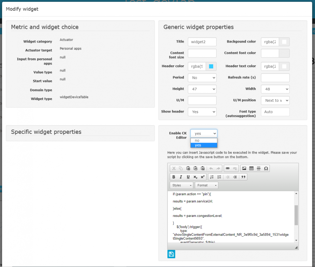 The JS function to be inserted in the appropriate CK Editor box (in more options) of the current widget is of the following type: