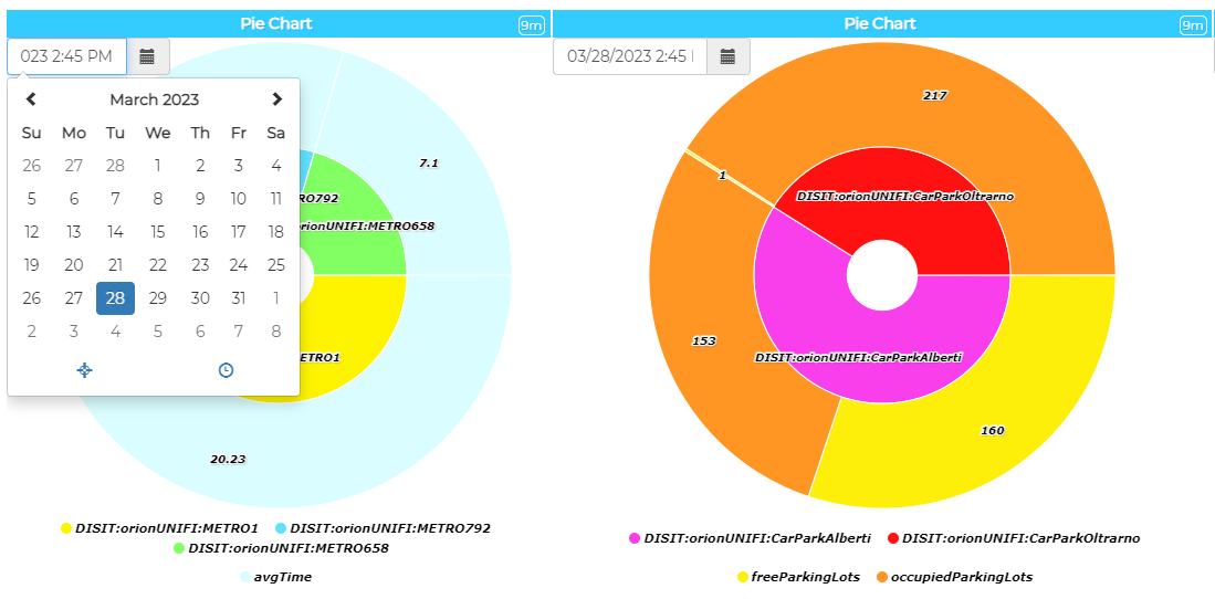 Widget PieChart also allows you to send a date and time parameter as input to another widget to insert in the calendar. In this way it is possible to synchronize more than one widget at the same moment in time.