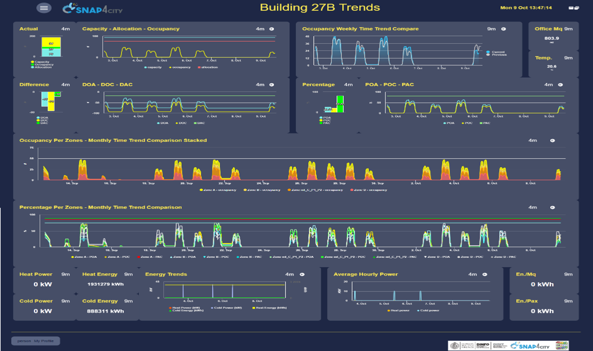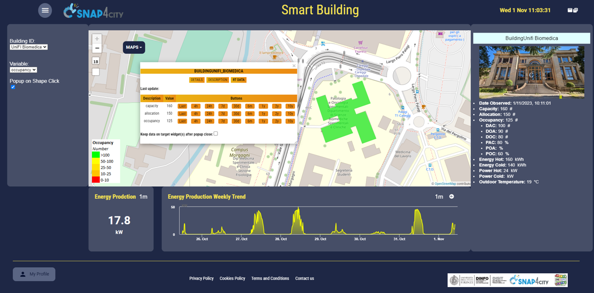 Moreover, Snap4Building can be connected with your data sources to keep the monitoring solution aligned to any change in the infrastructure due to restructuring and dynamic allocation of resources. Snap4Building can be customized according to data and environment taking modules and components from snap4City framework. The rendering on dashboards and Web Apps may include maps, time trends, stacked diagrams, origin destination flows, routing, energy heatmaps, temperature heatmap, pollutant heatmaps, video streams, pictures, forms, commands, people flow, etc.
