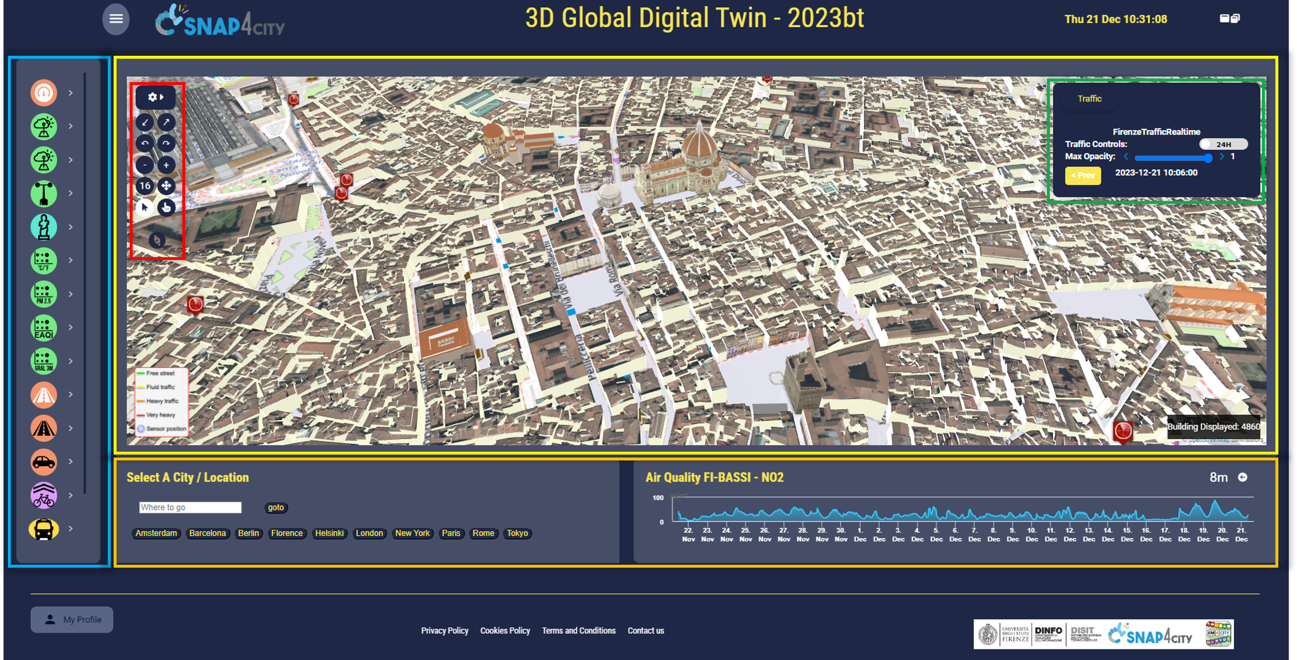 Main SCDT web interface: the dashboard is presented with LoD3 and HVB models shown together with PINs, 3D animated arrows for traffic, heatmaps, 3D Cylinders, trees. The blue rectangle highlitgh the selector menu. In yellow the main 3D multi-data map, with the in-map menu (red rectablge) and the interactive pannel (green rectangle). Under the map, in the orange rectangle, addional widget can be visualized.