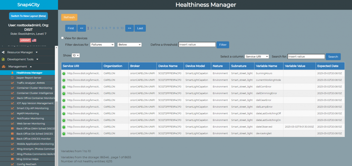 Finally, at the bottom of the page the range of records that are currently displayed is specified, along with the total number of records that match the current filter and the number of corresponding pages, as well as the number of the current page. Furthermore, the total number of devices currently not healthy that are contained in the database is returned (based on the filtering carried out). This is useful for keeping these values under control and to see if there are particular anomalies in the number of unhealthy devices. For example, we could notice if the number of results returned from the KB becomes saturated in some way (for example due to API implementation limits), thus leaving out some devices, or if due to some bad weather or specific phenomenon a considerable quantity of devices has become not healthy. The description tells us which records are currently displayed and how many pages of results the database contains.