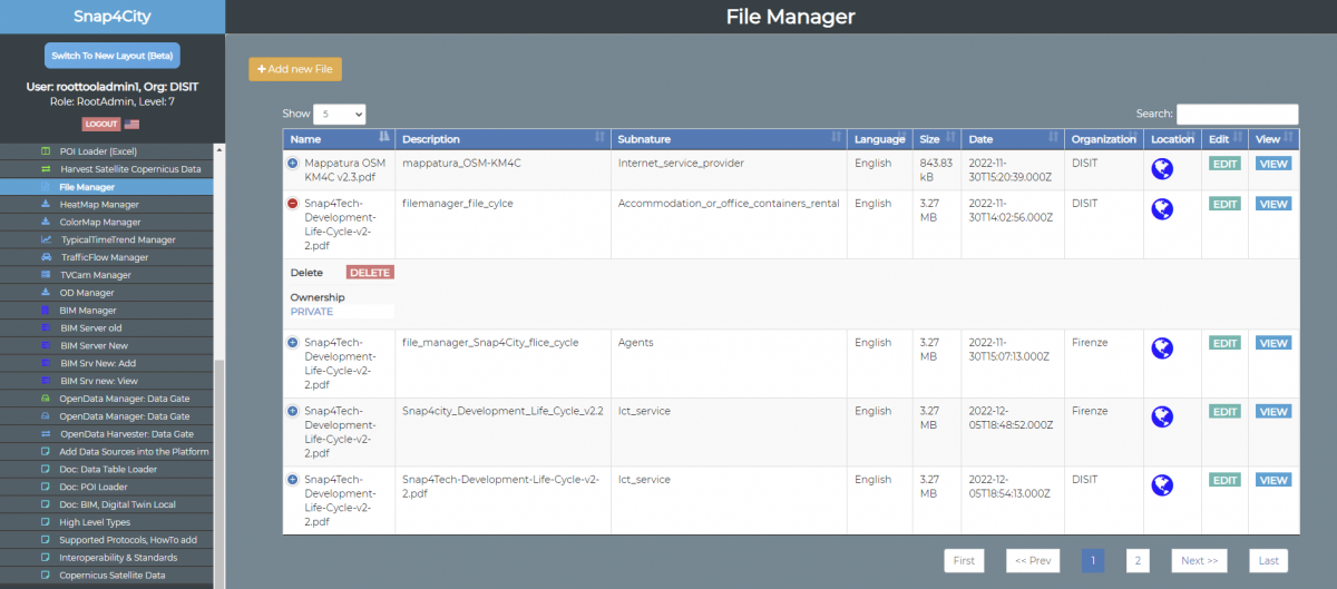 The File Manager is a manager of the HLT and it is accessible for mid nad high level administrator of the platform, while the access to the files depends on the delegation provided by the file owners as usual for all the entities and devices on Snap4City platform and technology.