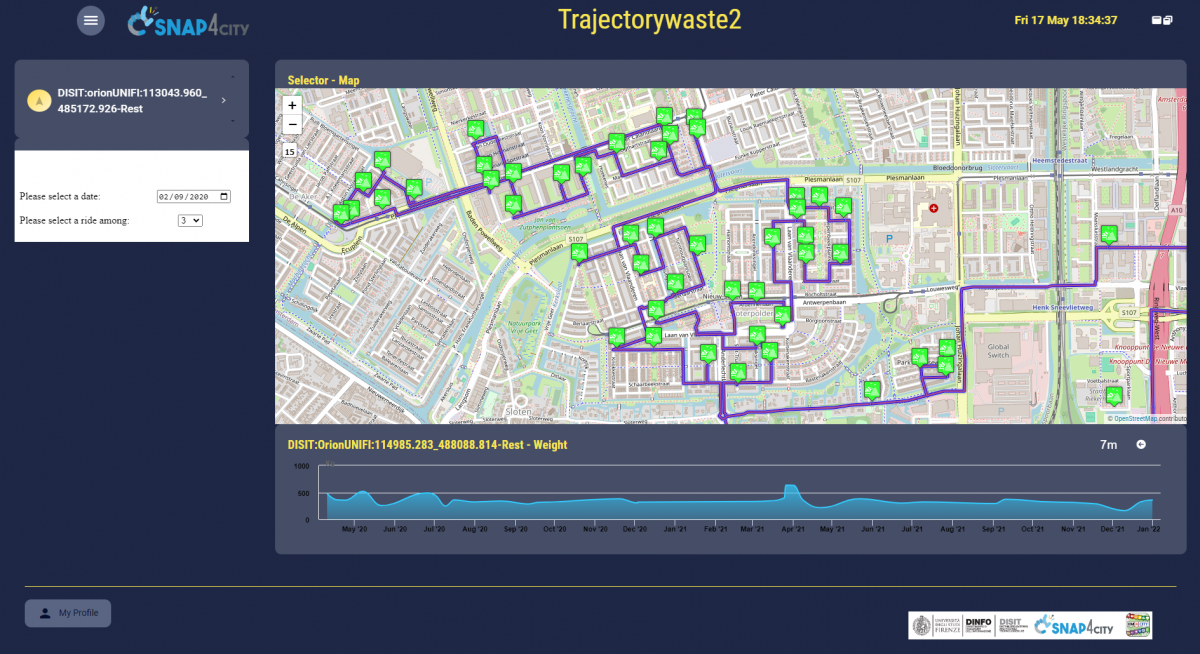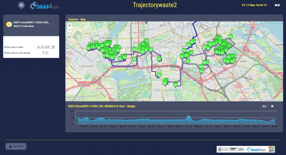 Snap4City is capable to identify the bins that risk to become true in advance (using predictive technologies based on AI, Deep Learning). On these aspects, the plan for waste collection including the rides is estimated and provided to the riders also exploiting the routing on the basis of the routing service of Snap4City. The paths for the operators can be provided to map on mobiles and also on the Snap4City mobile Apps of the series "in a Snap". On the basis of the plan, and the effective waste collection, reports and dashboards are provided including statistic and forecast. The actual trends is daily monitored including the alarms of eventual critical conditions notified from the citizens, and/or detected by sensors such as: fire, up-side-down, hurts, too filled, run out of battery, errors, etc. (some of these events can be enabled on the basis of the sensors positioned to the bin)