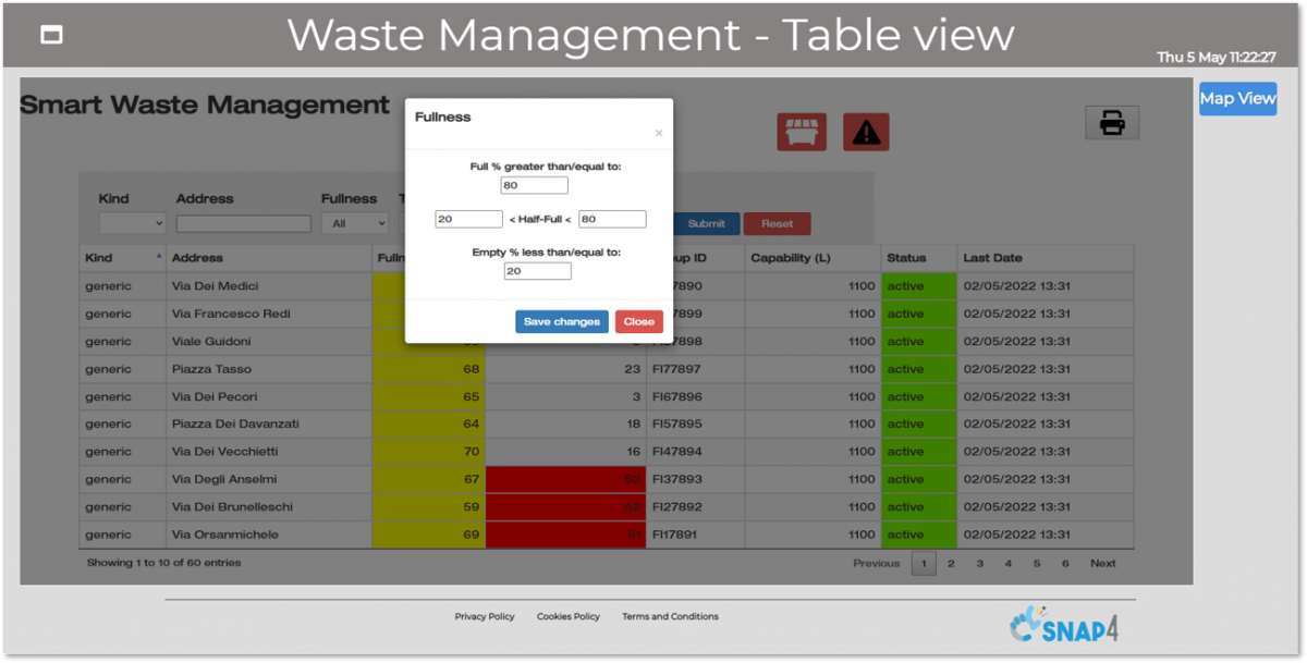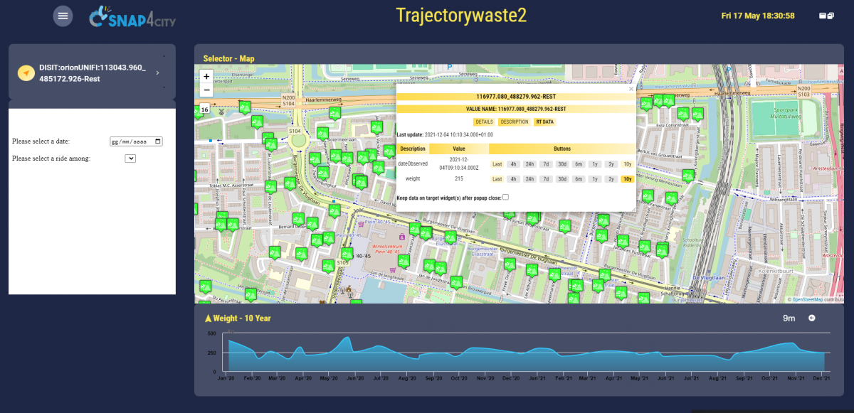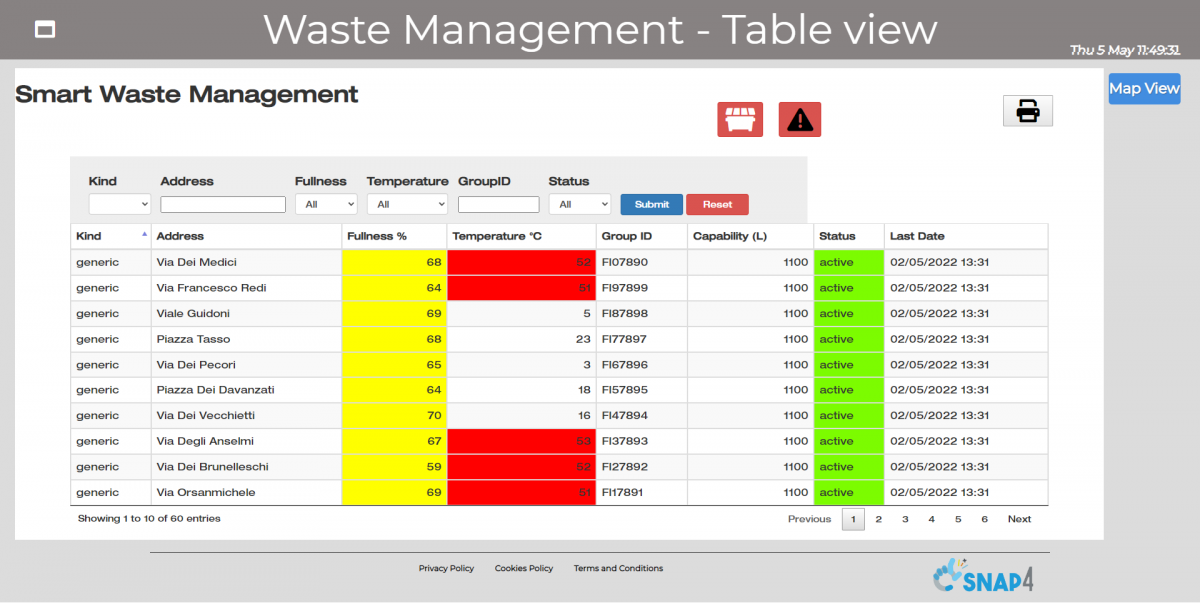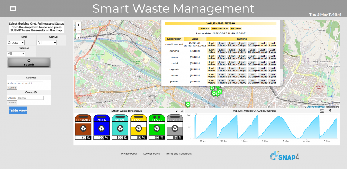 In the following scenario, a Smart Waste use case has been explored. The map view shows the different kinds of smart waste bins (generic, plastic, paper, glass, metal, organic) with their status (Full, Hal-full, Empty, and/or proportionally depicted on the graphic representation). Custom user interface and theme can be defined for each municipality as usual on Snap4City.