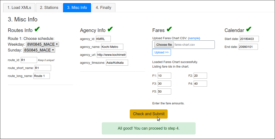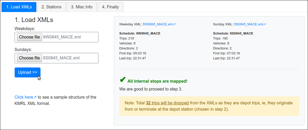 This page handles the specific XML format↗ of KMRL. There are some files to upload and some settings to set before converting to GTFS. Please make your way through each of the tabs.